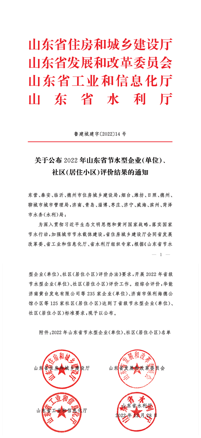 近日,山東省住房和城鄉(xiāng)建設廳會同山東省發(fā)展和改革委員會、山東省工業(yè)和信息化廳、山東省水利廳發(fā)布了《關于公布2022年山東省節(jié)水型企業(yè)(單位)、社區(qū)(居住小區(qū))評價結果的通知。經綜合評價,公司達到了省級節(jié)水型企業(yè)的標準要求,獲評山東省節(jié)水型企業(yè)。