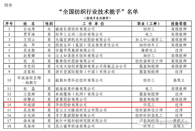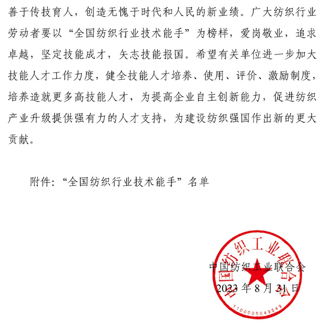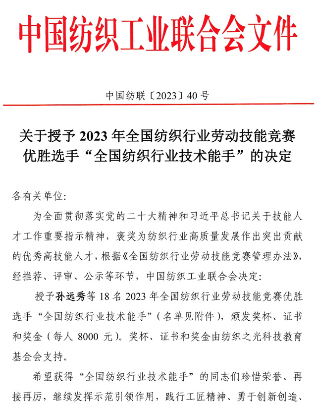 導(dǎo)讀:近日,中國(guó)紡織工業(yè)聯(lián)合會(huì)發(fā)布了授予在2023年全國(guó)紡織行業(yè)勞動(dòng)技能競(jìng)賽中取得前18名的紡織企業(yè)員工為“全國(guó)紡織行業(yè)技術(shù)能手”榮譽(yù)稱號(hào)的決定,