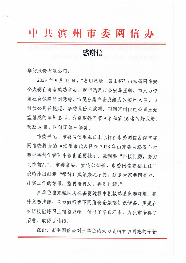 近日,公司收到一封來自濱州市委網(wǎng)信辦的感謝信,信中高度肯定了公司互聯(lián)信息部信息中心信息安全管理員崔乘耀在2023年9月15日“啟明星辰·泰山杯”山東省網(wǎng)絡(luò)安全大賽中所做出的突出貢獻,信中指出:“貴單位崔乘耀同志在備賽過程中積極熟悉競賽環(huán)境、提升競賽技能,全力做好線下網(wǎng)絡(luò)安全基礎(chǔ)知識儲備,更是在攻防技能練習(xí)上精益求精,付出了辛勤汗水,為我市爭得了榮譽,取得了佳績。”