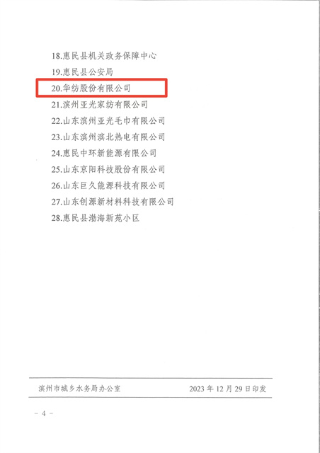 2023年,在全國(guó)紡織行業(yè)綠色發(fā)展勞動(dòng)競(jìng)賽中,公司榮獲節(jié)水標(biāo)桿企業(yè);在濱州市創(chuàng)建國(guó)家節(jié)水型城市省級(jí)復(fù)查工作中,公司高質(zhì)量、高標(biāo)準(zhǔn)完成各項(xiàng)工作任務(wù),為順利通過(guò)省級(jí)復(fù)查奠定了基礎(chǔ)。