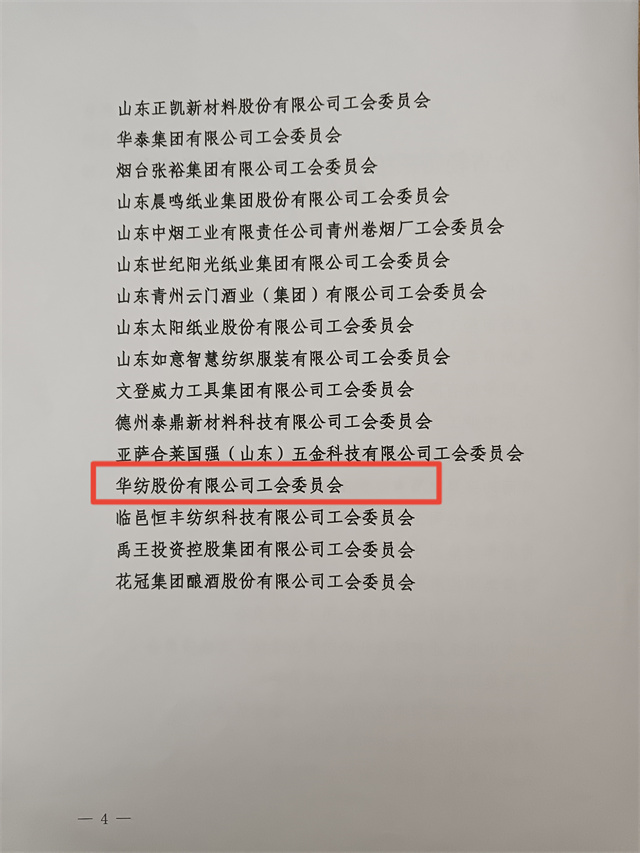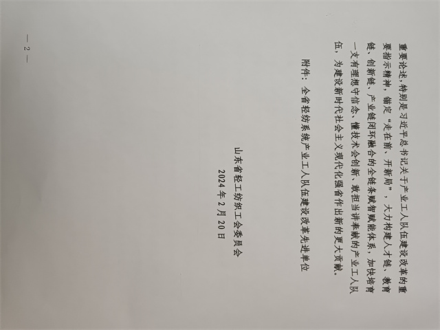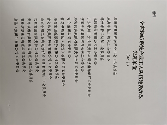 近日,省輕工紡織工會三屆四次全委會暨全省輕紡系統(tǒng)產(chǎn)業(yè)工人隊伍建設(shè)改革推進會議在濟南召開。會上公布了全省輕紡系統(tǒng)產(chǎn)業(yè)工人隊伍建設(shè)改革先進單位名單,公司工會委員會名列其中。