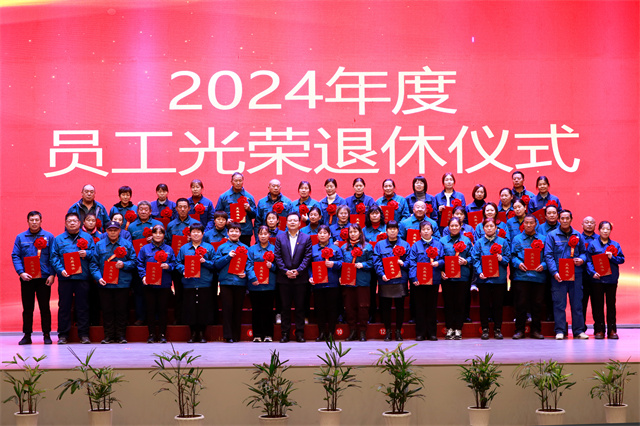 會上,為2024年度退休的員工舉辦了光榮退休儀式。公司黨委委員、紀委副書記、副總經(jīng)理孫玉濤宣讀了2024年度退休員工名單;黨委書記、董事長盛守祥為退休員工代表頒發(fā)榮譽證書;退休員工張炳營代表67位退休員工作退休感言。