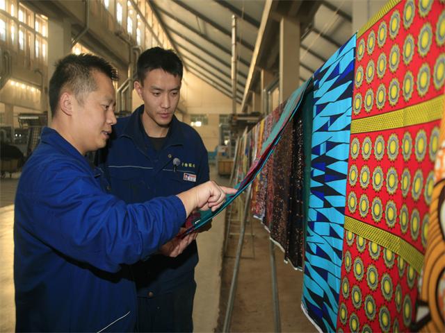 11月23日,在公司花二車間的生產(chǎn)現(xiàn)場,工程師田道國(左)與印制乙班班長寧方乾(右)來到“疵布展示區(qū)”,就最近兩天印花產(chǎn)品的質(zhì)量情況進(jìn)行交流與討論。